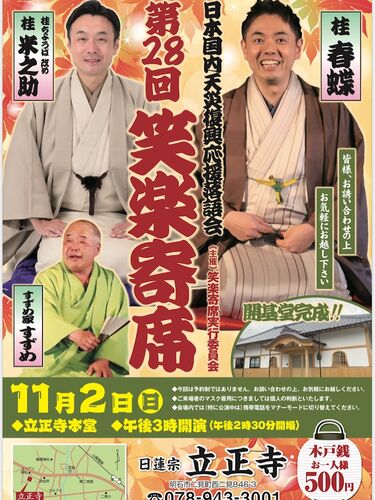 笑楽寄席実行委員会からの告知です! 久々に、お寺の落語会開催です。ポスター完成しました! お近くの方、お時間ありましたら、お気軽にお越しください🙏 当会大看板の桂春蝶師匠に、ちょうば改め桂米之助師匠をお迎えします!もちろん、すずめ家すずめさんも…